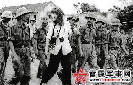 美国著名反战人士,影星简.方达和越南人民军战士一起在nghe An省行走,简.方达要求不搞特殊,和战士们同吃同住。(1972)